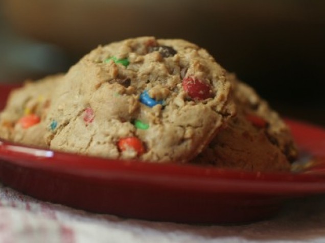 Preheat oven to 350 F. In a large mixing bowl (or stand mixing bowl), cream the butter and sugars together. Add the eggs one at a time. Mix in the vanilla extract and honey. Add the peanut butter and mix well. In a separate mixing bowl, combine the flour, baking soda and oats. Add the dry ingredients to the butter mixture and combine well. Mix in the chocolate chips and M&M’s until just combined.