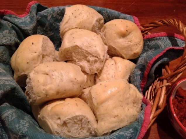 In the bowl of a stand mixer, add the water, yeast, flour, olive oil, salt, thyme, basil and rosemary in that order (careful not to let the salt touch the yeast). Knead for 5 minutes. Turn dough into a greased bowl and spray the top of the dough with cooking spray or cover with a damp towel and let rise for 30-40 minutes. Punch down dough and with a bench scraper divide the dough into 12 equal parts. Roll each into a ball and place on a greased rimmed baking sheet or oven proof baking dish. Let rise for 30-40 minutes. Preheat oven to 350 F.