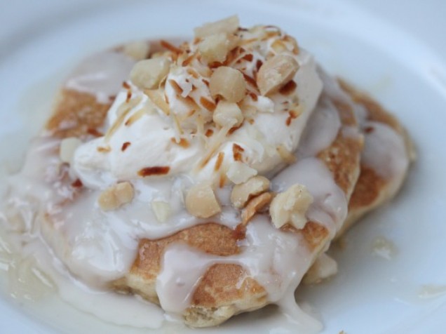 Banana Macadamia Nut Pancakes with Coconut Syrup