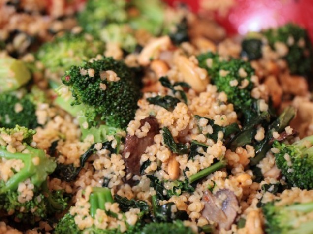 In a large mixing bowl, combine the bulgar wheat, sautéed vegetables and roasted nuts. Toss with the dressing. Serve warm or at room temperature or cold.