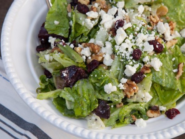 Toss lettuce with desired amount of dressing. Add the cheese, nuts and cried cranberries and toss again. Garnish with some feta cheese crumbles.