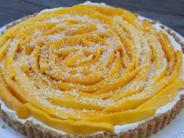 Place the slices of mango around the tart in the filling in a circular pattern starting with the outside edges and finishing in the middle. Garnish with a sprinkling of unsweetened shredded coconut. Serve immediately or keep chilled in the refrigerator.