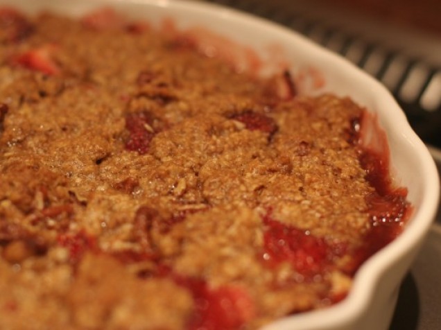 Grease the bottom of a 9×13 baking dish. Add the strawberry/ rhubarb mixture on the bottom of the dish. Lay the crisp topping lightly over the whole top; do not press down. Bake at 350 F for 45-50 minutes or until the fruit mixture is bubbling and the crisp topping is golden. Serve warm.